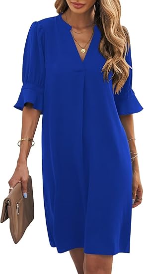 Dress for Women V Neck Short Sleeves Solid Color Casual Flowy Summer Dresses(S-2XL)